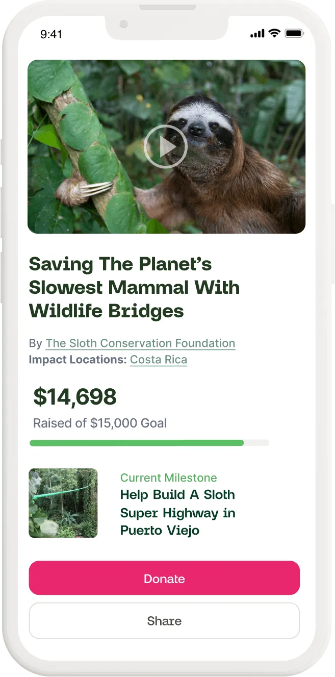 Our milestone based fundraising model displays your impact within a larger story and "impact feed" that keeps donors engaged, giving, and sharing your results with their networks.